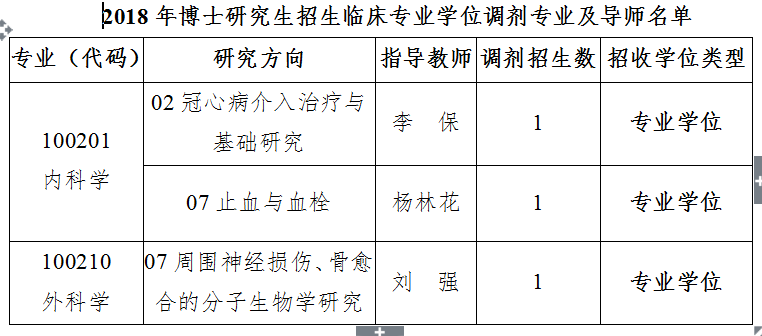 经学校博士研究生招生工作领导组研究决定,现将2018年博士研究生临床专业学位招生调剂工作有关事宜通知如下: