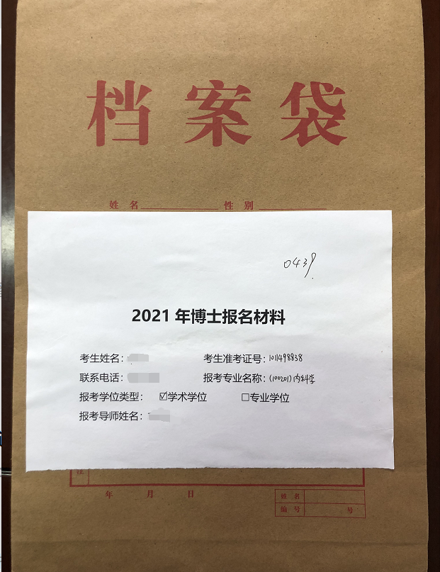 考生完成网上报名并确定报名志愿后,按照清单列表将个人报考材料统一装入自备的档案袋内(见图例1、2)。研招办将在考生提交材料后进行审核。
