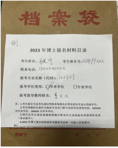 考生完成网上报名并确定报名志愿后,按照清单列表将个人报考材料统一装入自备的档案袋内(见图例1、2)。