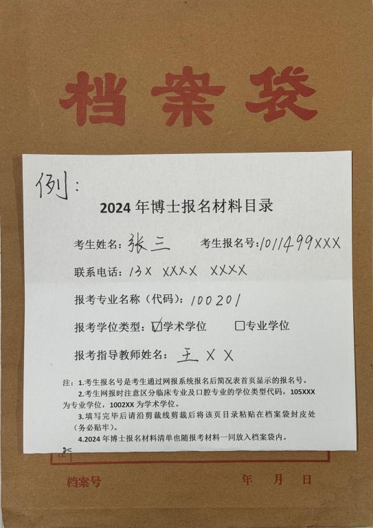 考生完成网上报名并确定报名志愿后,按照清单列表将个人报考材料统一装入自备的档案袋内(见图例1、2)。