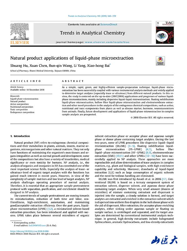 3月21日,我校药学院药物分析教研室白小红教授课题组应分析化学TOP 1学术期刊Trends in Analytical Chemistry邀请撰写的《Natural product applications of liquid-phase microextraction》正式发表(Shuang Hu, Xuan Chen, Run-qin Wang, Li Yang, Xiao-hong Bai. Natural product applications of liquid-phase microextraction.TrAC,2019,113:340-350)。