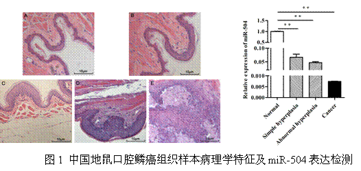 根据中国地鼠口腔鳞状细胞癌动物模型组织样本的病理学特征将肿瘤的癌变分为四个阶段:药物诱导不同时间后中国地鼠的颊囊组织由正常上皮逐渐变为单纯增生的上皮组织,再到异常增生的上皮组织,并最终演变为口腔鳞状细胞癌(原位癌)。在不同病变阶段的动物组织样本中miR-504的表达随着肿瘤的不断恶化逐渐降低(图1)。