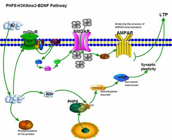 铝是一种与人类有广泛接触的环境神经毒素。铝毒性的分子机制尚不清楚。许多研究表明,接触铝会损害学习和记忆功能。本研究旨在探讨铝暴露诱发长时程增强(LTP)损伤的机制及相关信号通路。结果表明,铝处理对LTP产生剂量依赖性抑制,降低了组蛋白H3K9去甲基化(H3K9me2)去甲基化酶活性和PHD (plant homeodomain)手指蛋白8 (PHF8)的表达。有趣的是,PHF8基因的表达在统计学上没有显著差异,这表明铝暴露只影响翻译过程。脑源性神经营养因子(BDNF)表达的减少可能与铝的作用有关。通过对铝暴露大鼠海马标准化场兴奋性突触后电位(fEPSP)振幅与各种蛋白表达的相关性分析,发现海马标准化场兴奋性突触后电位振幅与海马PHF8、BDNF蛋白表达呈正相关,与海马H3K9me2蛋白表达呈负相关。H3K9me2与BDNF呈负相关。结果表明,突触可塑性的变化可能与铝暴露引起的这些蛋白的变化有关。综上所述,慢性铝暴露可能抑制PHF8并阻止其发挥去甲基化酶的功能。这可能阻碍H3K9me2去甲基化,降低BDNF蛋白表达,导致LTP受损。