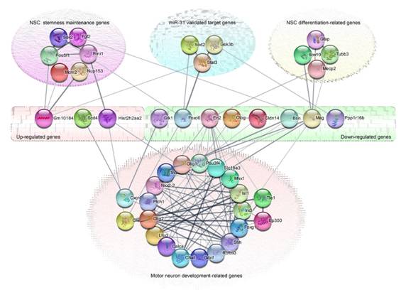 王春芳课题组在前期的研究中发现与运动神经元相比,miR-31在神经干细胞中表达显著增高,可能在神经干细胞的增殖和向运动神经元的分化中起重要作用。为了更好地理解miR-31的作用,课题组研究了miR-31过度表达后脊髓源性神经干细胞早期的mRNA和miRNAs表达谱,发现miR-31高表达组与对照组有差异表达mRNA 35个,差异表达miRNA 190个。与对照组相比,上调表达的mRNAs和miRNAs均与神经干细胞的干细胞维持有关,并抑制其向运动神经元的分化,而下调表达的功能则相反。