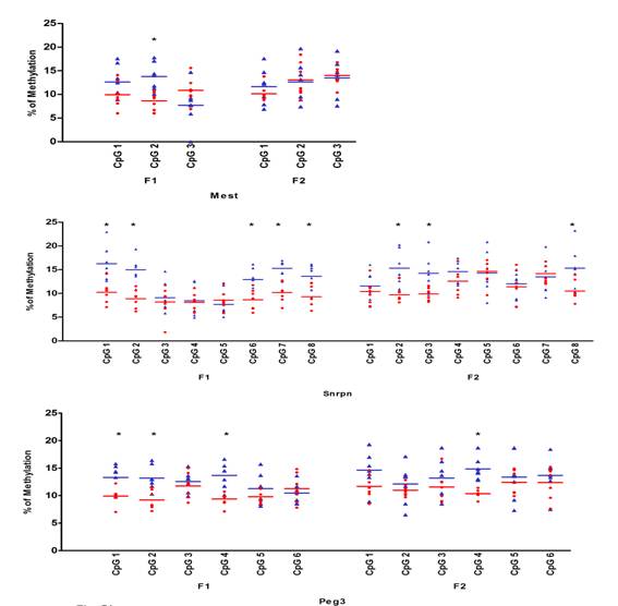 BaP诱导未暴露后代印记基因DMR区甲基化水平改变。亚硫酸盐焦磷酸测序测定未暴露的F1-2后代精子DNA印记基因H19、Peg1和Igf2以及印记基因Meg3、Peg3和Snrpn的甲基化水平。显示的数据是来自BaP2.5和对照组的各7只实验动物独立CpG位点的甲基化水平。比较对照组小鼠,横线代表均数。*,q<0.05(FDR,通过多重测试纠正)