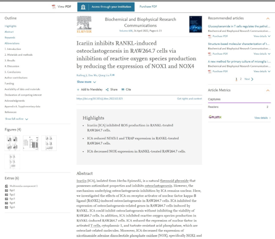 研究成果发表在国际期刊《Biochemical and Biophysical Research Communications》上,文章题目为Icariin inhibits RANKL-induced osteoclastogenesis in RAW264.7 cells via inhibition of reactive oxygen species production by reducing the expression of NOX1 and NOX4”。