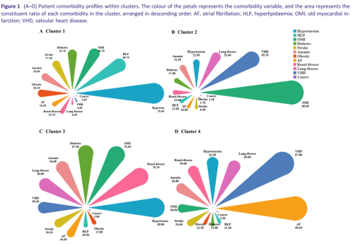 该团队收集2014年1月至2019年4月CHF住院患者的电子病历,将12种常见共病纳入潜在类别分析。从 4063 名患者中确定了四个不同的临床集群:代谢性、缺血性、高共病负荷和老年房颤集群。