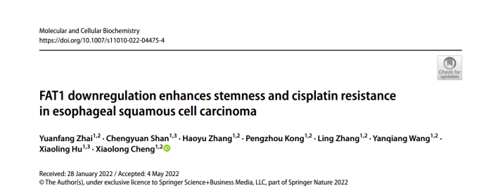 崔永萍课题组报道食管鳞癌中FAT1调控细胞的干性和顺铂耐药性