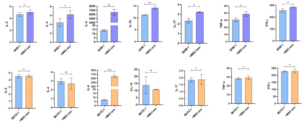 在本工作中,研究团队通过共培养后发现AML细胞株来源的外泌体抑制MDS细胞株的增殖、阻滞细胞周期进展、促进细胞凋亡和分化以及可致MDS细胞分泌更多的TNF-α和ROS。而间充质干细胞来源的外泌体可抑制MDS细胞的增殖、阻滞细胞周期进展、促进细胞凋亡、抑制细胞分化以及释放更多的IL-6。