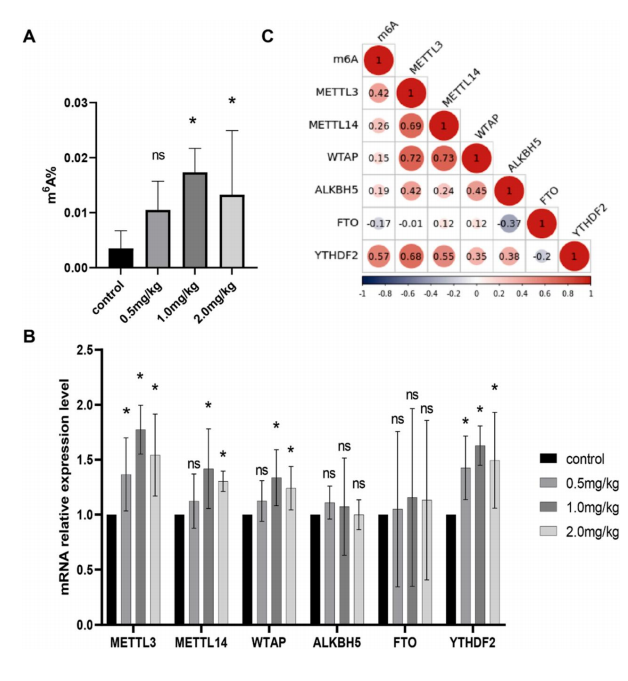 本研究采用皮下注射氯化镉(0.5、1.0、2.0 mg/kg)的 方法构建了大鼠肾损伤模型。测定 m 6A 总体水平和 m 6A 修饰酶METTL3、METTL14、WTAP、ALKBH5、FTO)的相对表达水平, 结果显示 1.0 mg/kg 和 2.0mg/kg 处理组总 m 6A 水平显著高于 对照组,且与对照组相比,各暴露组的 METTL3、METTL14、WTAP 和 YTHDF2 均显著上调(P > 0.05),见图 2。