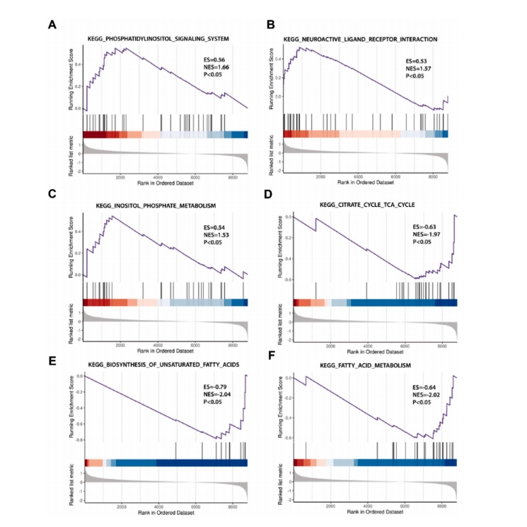 随后,对测序数据进行 GO 和 KEGG 分析,结果显示,在Cd 诱导的肾损伤中,m 6A 修饰位点上调的基因可能调节炎症反应,如 IL-17、NOD 受体和 Notch 信号通路等炎症相关通路。且利用基因集富集分析(GSEA)分析了测序基因的功能富集途径,结果发现下调表达基因与脂肪酸代谢和不饱和脂肪酸的生 物合成有关。提示炎症、脂肪代谢相关通路可能参与Cd 诱导肾损伤过程,见图 4、图 5。