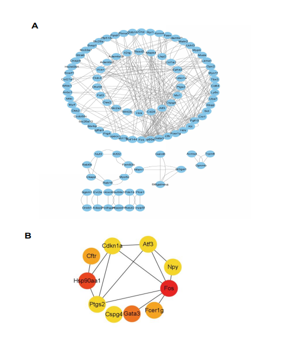 此外,还构建了蛋白-蛋白相互作用(PPI)网络并选择了 10 个关键基因(Fos, Hsp90aa1, Gata3, Fcer1g, Cftr, Cspg4, Atf3, Cdkn1a, Ptgs2 和 Npy),为进一步研究镉致肾损伤可能 机制提供新思路,见图 6。