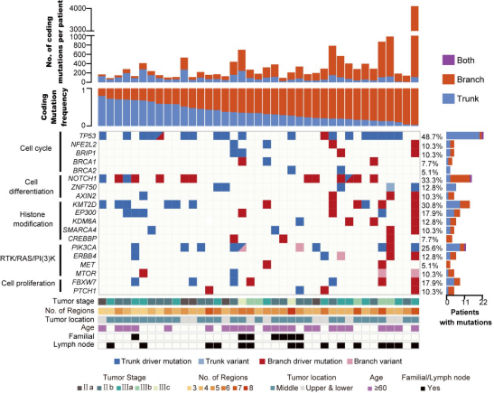 研究人员对来自39例肿瘤样本的185个肿瘤区域和39个匹配的正常样本进行了测序分析,平均测序深度分别达到290×和187×。共检测到11,703个非沉默单核苷酸变异和961个插入缺失变异,每个样本中位数为189个非沉默变异和14个插入缺失,突变数量在个体中差异很大。具有较大肿瘤体积的食管鳞癌个体的突变负荷高于具有较小肿瘤的个体。同时发现通过多区域测序鉴定的个体的突变显著高于单区域分析或来自癌症基因组图谱(TCGA)突变数据的突变。此外还发现有12.8%的ERBB4突变,并且功能实验证明了它的致癌作用;敲低BRCA1/2的表达,显著增加了食管鳞癌细胞对铂类药物的敏感性;5%的个体携带CD274的局部高水平扩增,导致PDL1的大量表达,这类个体可能对免疫检查点阻断更敏感。该研究揭示了食管鳞癌中的高度异质性,确定了ERBB4、BRCA1/2和PD-L1这几个潜在的治疗靶点,并可能为食管鳞癌治疗提供新的策略。