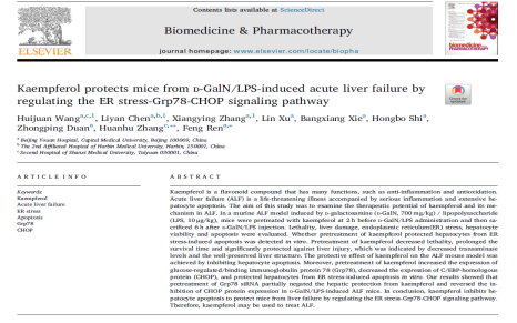 2019年3月,在“Biomedicine & Pharmacotherapy ”(生物医学与药物治疗,IF=3.245),以论著的形式发表首都医科大学附属北京佑安医院,北京市肝病研究所任锋教授课题组的“Kaempferol protects mice from D-GalN/LPS-induced acute liver failure by regulating the ER stress-Grp78-CHOP signaling pathway ”(山奈酚通过调控内质网应激Grp78-CHOP通路抑制D-GalN/LPS诱导的小鼠急性肝衰竭)相关分子机制研究成果,为临床急性肝衰竭的防治提供了分子实验研究基础。