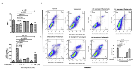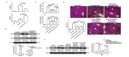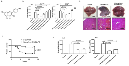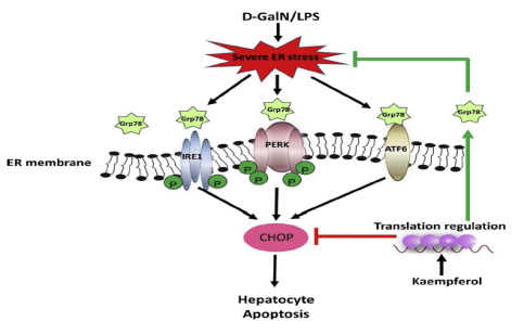 研究团队利用D-GalN/LPS联合运用建立急性肝衰竭小鼠模型,并用山奈酚作为干预药物经尾静脉注射作为实验组。通过qRT-PCR、Western blotting、细胞免疫荧光、免疫组织化学、小干扰RNA等分子生物学实验证实,山奈酚降低了急性肝衰竭模型小鼠肝功能生化指标(ALT、AST)减缓了病理损伤,抑制了肝细胞凋亡。其主要是通过上调内质网应激相关因子Grp78并降低内质网-凋亡相关因子CHOP的表达,从而抑制了D-GalN/LPS诱导的小鼠急性肝衰。