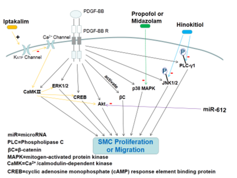 在正常情况下,PDGF-BB诱导一些因子的激活,最终刺激平滑肌细胞(SMCs)增殖和迁移。然而,Iptakalim能抑制CaMKⅡ的激活;microRNA(miR)612的过表达抑制了PDGF BB诱导的Akt蛋白表达;异丙酚可减轻PDGF-BB诱导的p38 MAPK磷酸化;明日扁柏醇抑制JNK1 / 2和PLC-γ1磷酸化(图3)。