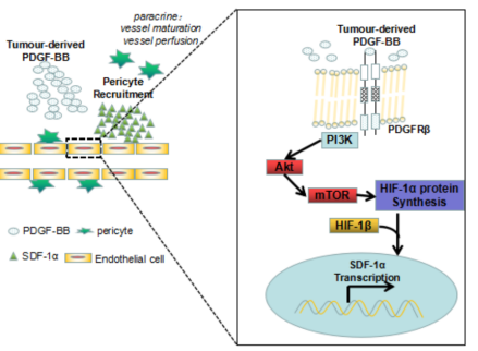 阻断SDF-1α/CXCR4轴不仅可以在体外消除PDGF-BB诱导的周细胞募集,而且可以显著降低PDGF-BB过度表达中肿瘤的周细胞覆盖率。此外,由于SDF-1α的mRNA合成上调,PDGF-BB以旁分泌的方式可以增加ECs中SDF-1α的分泌,这种上调机制主要依赖于通过PI3K/Akt/mTOR信号传导途径激活HIF-1α(图2)。
