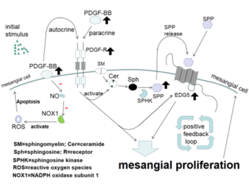 PDGF-BB在IgA肾病(IgAN)中的刺激机制可能包括内皮分化基因-5(EDG5),一种鞘氨醇1-磷酸(SPP)受体。PDGF-SPP-EDG通路可能表现为一个正反馈回路,可以增强连接生长因子信号传导和细胞增殖活性的事件级联(图1)。