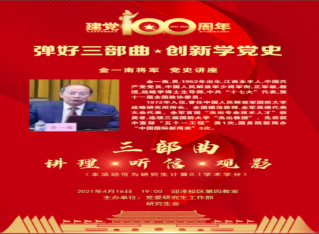 此次活动横向采取讲理留痕,听信留味,观影留念的空间递进引导模式,纵向按照建党前后发展历程的顺推时间脉络,活动按照讲理、听信、观影的顺序每周安排一次,每课安排3-5名同学课后谈感想,今天讲理系列一主要播放“金一南教授的党史辅导视频资料”,全程活动大家积极踊跃,活动结束后大家都感到活动创意独特、内容新颖、发人深省。又一次让全体参会学生感同身受的体验到学史、悟史、崇史的精神味道。切实为学校党史学习助力,为建党一百周年献礼!